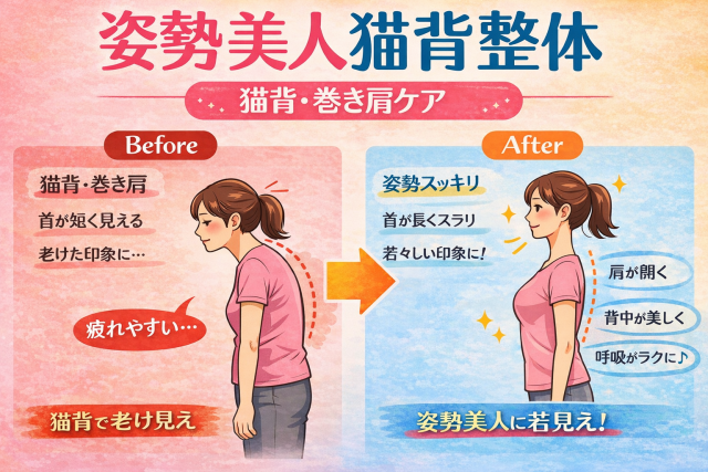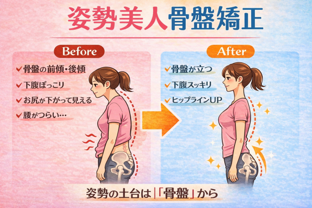 背中(猫背・巻き肩)と体の土台である骨盤の両方を整えることで、