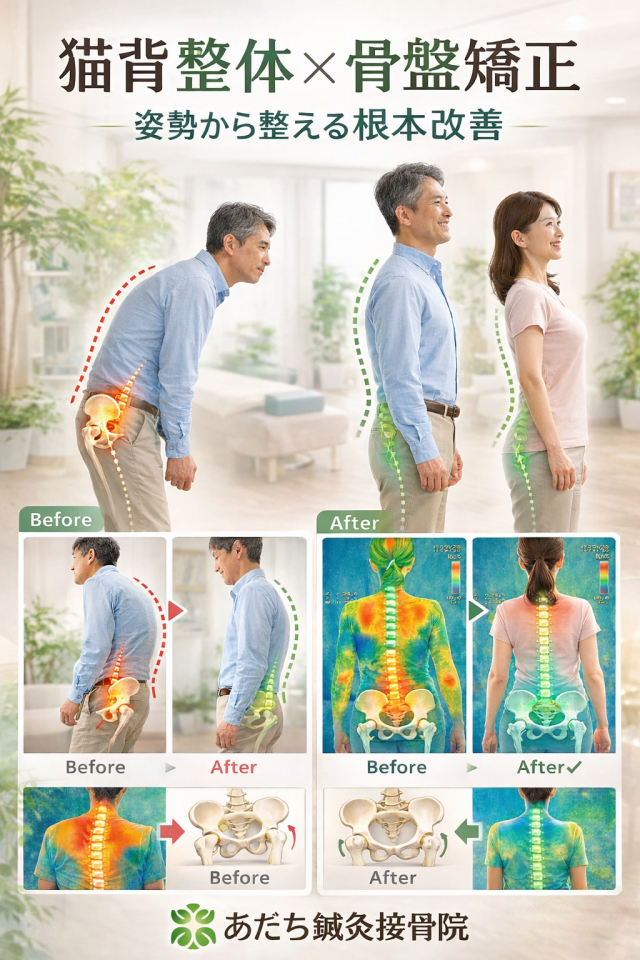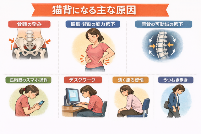 **「猫背」と「骨盤の歪み」**が同時に関係しているケースが非常に多く見られます。